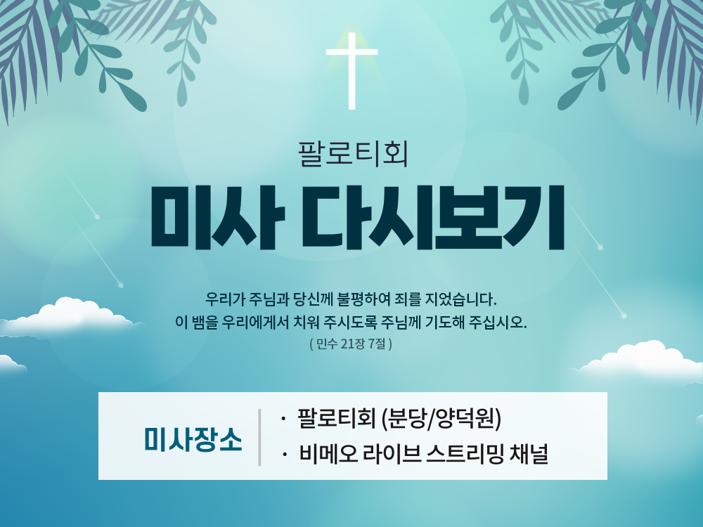 미사시간에 해당 영상을 클릭하면 팔로티회 실시간 스트리밍 온라인 미사에 참여할 수 있습니다.