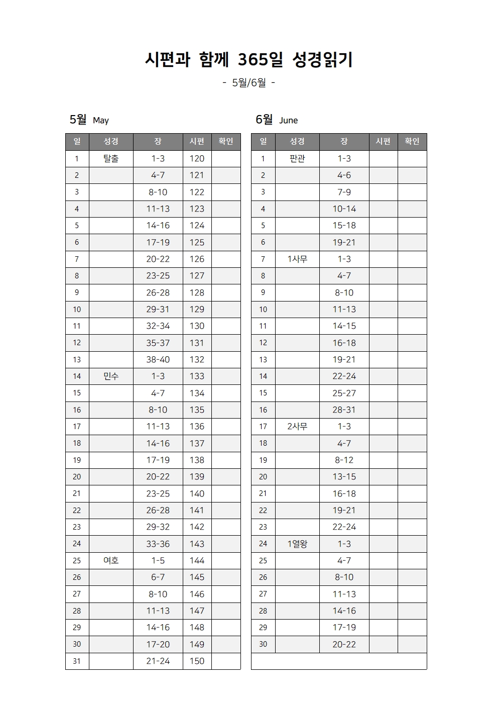시편과 함께하는 1년 365일 성경읽기표는 매일 시편과 함께 성경을 읽는 계획표입니다. 시편은 1년에 2번 읽게 되고 6월과 12월은 읽고 싶은 시편을 찾아 자유롭게 읽을 수 있습니다.