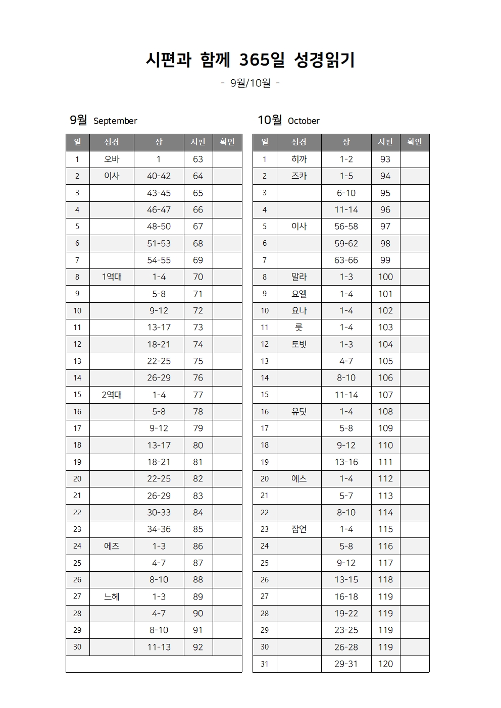 1년동안 구약과 신약성경 전체를 완독하는 성경읽기표입니다. 구약 46권과 신약 27권 총 73권의 천주교 성경을 365일로 나누어 배치한 성경읽기표 베스트 3가지 종류를 파일 첨부합니다.