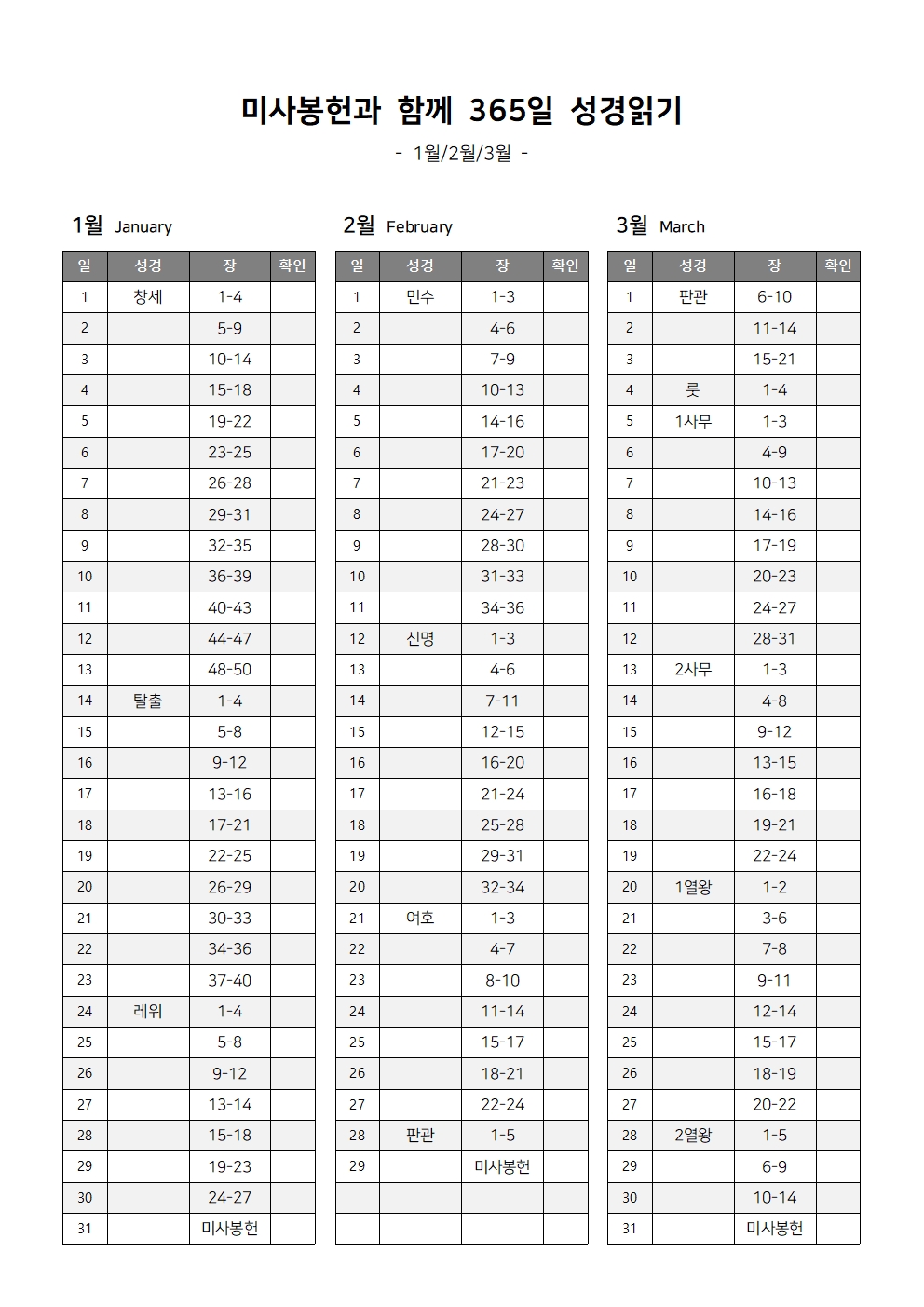 미사봉헌과 함께하는 1년 365일 성경읽기표는 매달 말일 미사봉헌이 포함되어 있는 성경 읽기 계획표입니다.