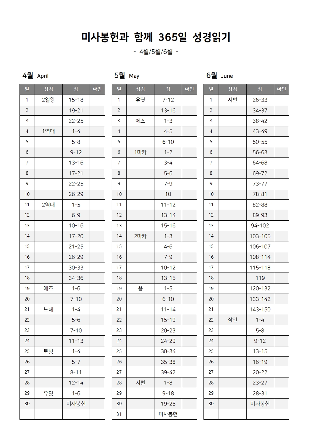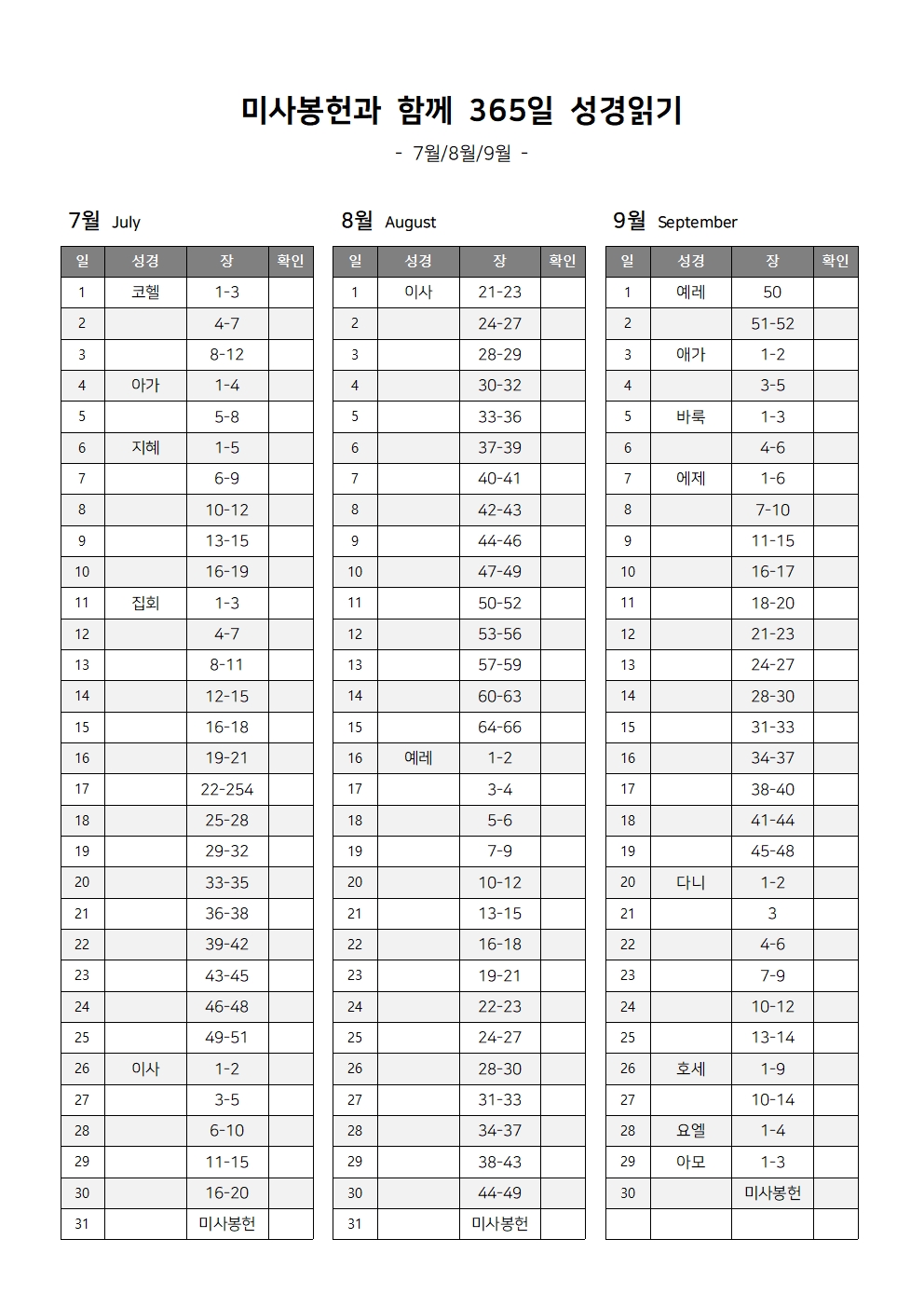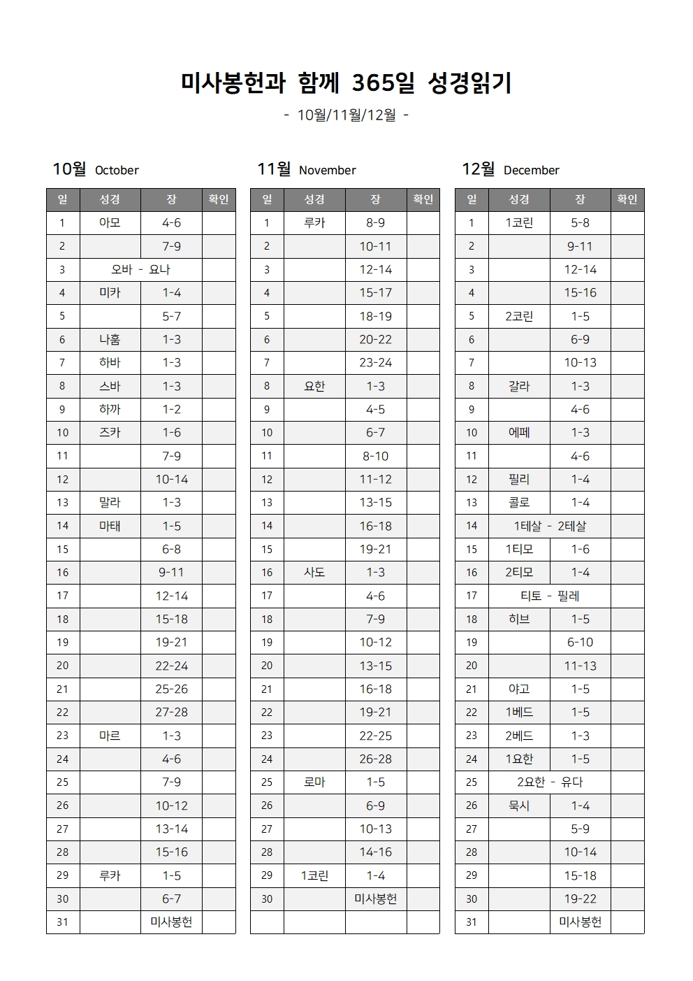 미사봉헌과 함께하는 1년 365일 성경읽기표는 매달 말일 미사봉헌이 포함되어 있는 성경 읽기 계획표입니다.