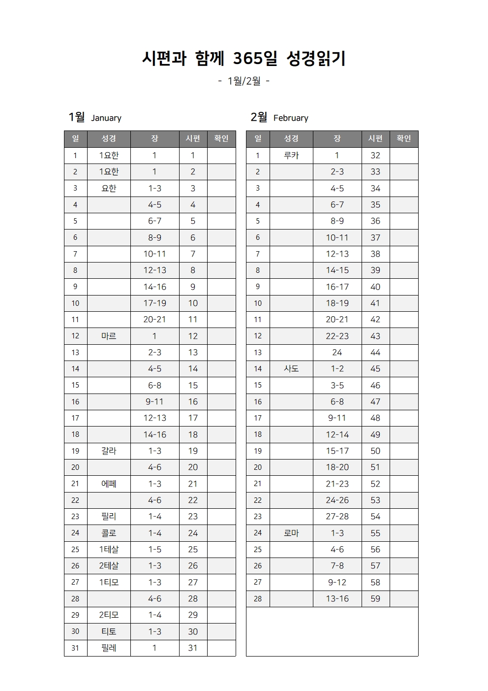 1년동안 구약과 신약성경 전체를 완독하는 성경읽기표입니다. 구약 46권과 신약 27권 총 73권의 천주교 성경을 365일로 나누어 배치한 성경읽기표 베스트 3가지 종류를 파일 첨부합니다.