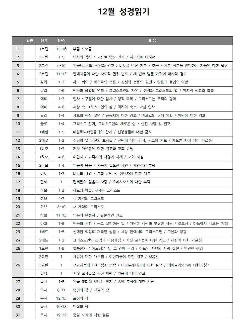 아래 첨부파일을 클릭하면 12월 성경읽기표를 다운로드할 수 있습니다.