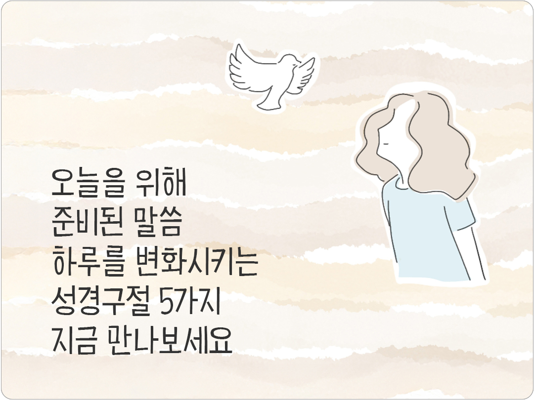 성경 말씀은 단순한 문장이 아니라 삶을 비추는 빛이 되어 하루를 변화시키는 힘이 있어요. 말씀 한 구절이 오늘을 새롭게 하고 큰 기적을 이끌어냅니다. 하루를 변화시키는 성경구절 5가지, 지금 만나보세요! 한 말씀이 오늘을 바꾸는 기적이 되기를 빕니다.