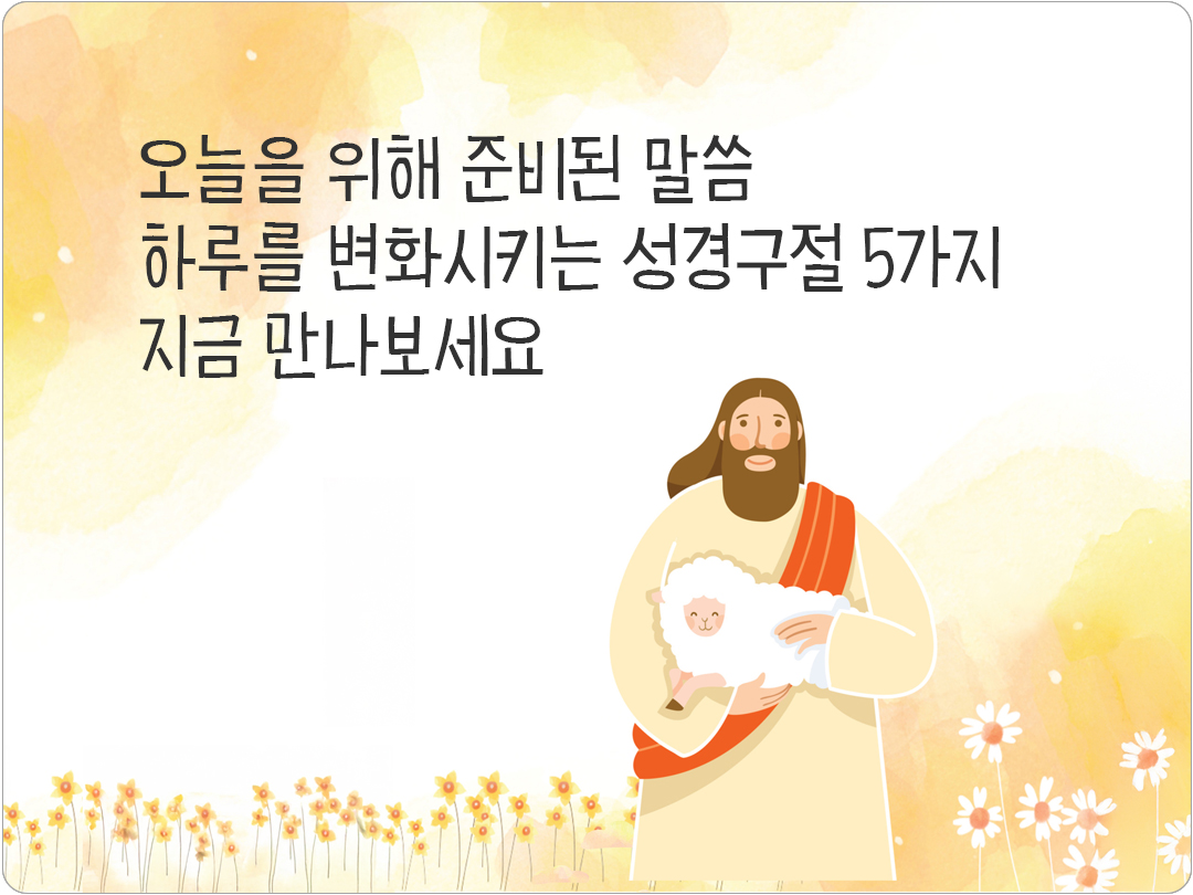성경 말씀은 단순한 문장이 아니라 삶을 비추는 빛이 되어 하루를 변화시키는 힘이 있어요. 말씀 한 구절이 오늘을 새롭게 하고 큰 기적을 이끌어냅니다. 하루를 변화시키는 성경구절 5가지, 지금 만나보세요! 한 말씀이 오늘을 바꾸는 기적이 되기를 빕니다.