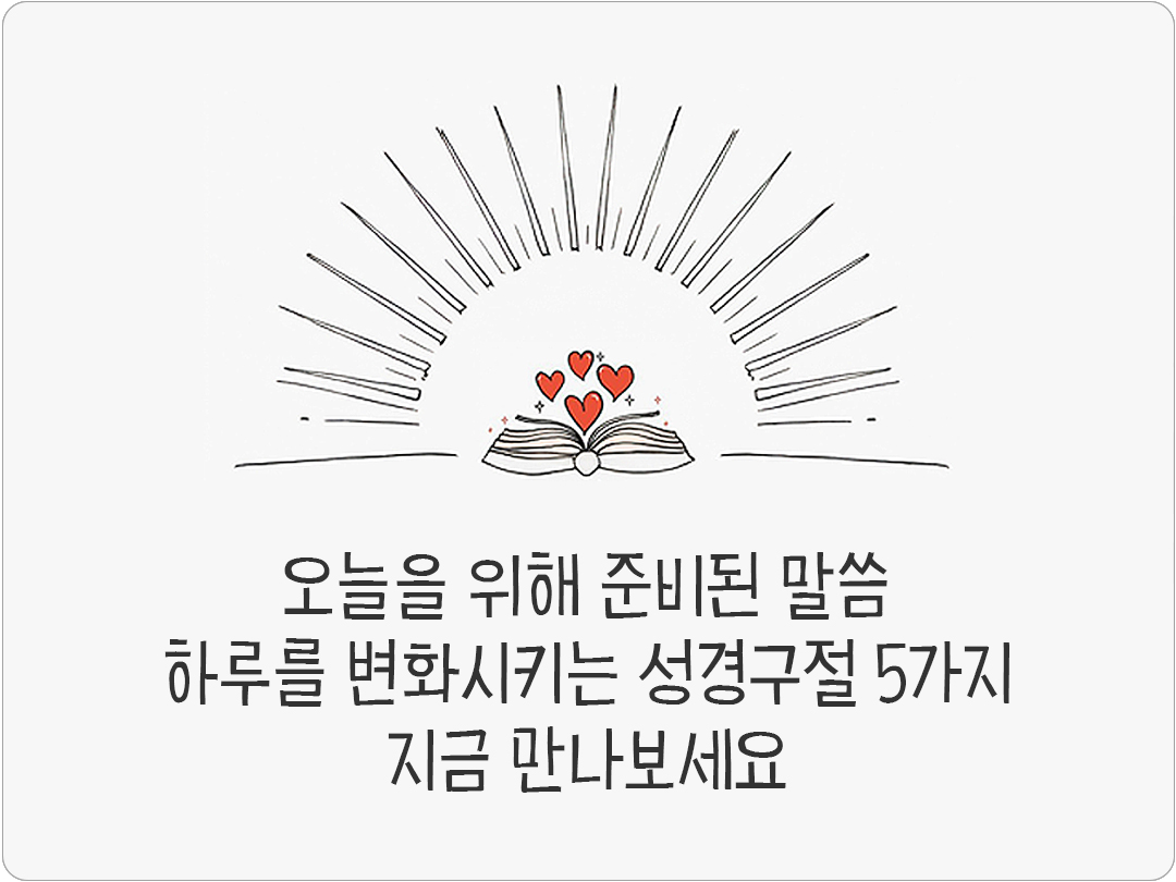 성경 말씀은 단순한 문장이 아니라 삶을 비추는 빛이 되어 하루를 변화시키는 힘이 있어요. 말씀 한 구절이 오늘을 새롭게 하고 큰 기적을 이끌어냅니다. 하루를 변화시키는 성경구절 5가지, 지금 만나보세요! 한 말씀이 오늘을 바꾸는 기적이 되기를 빕니다.