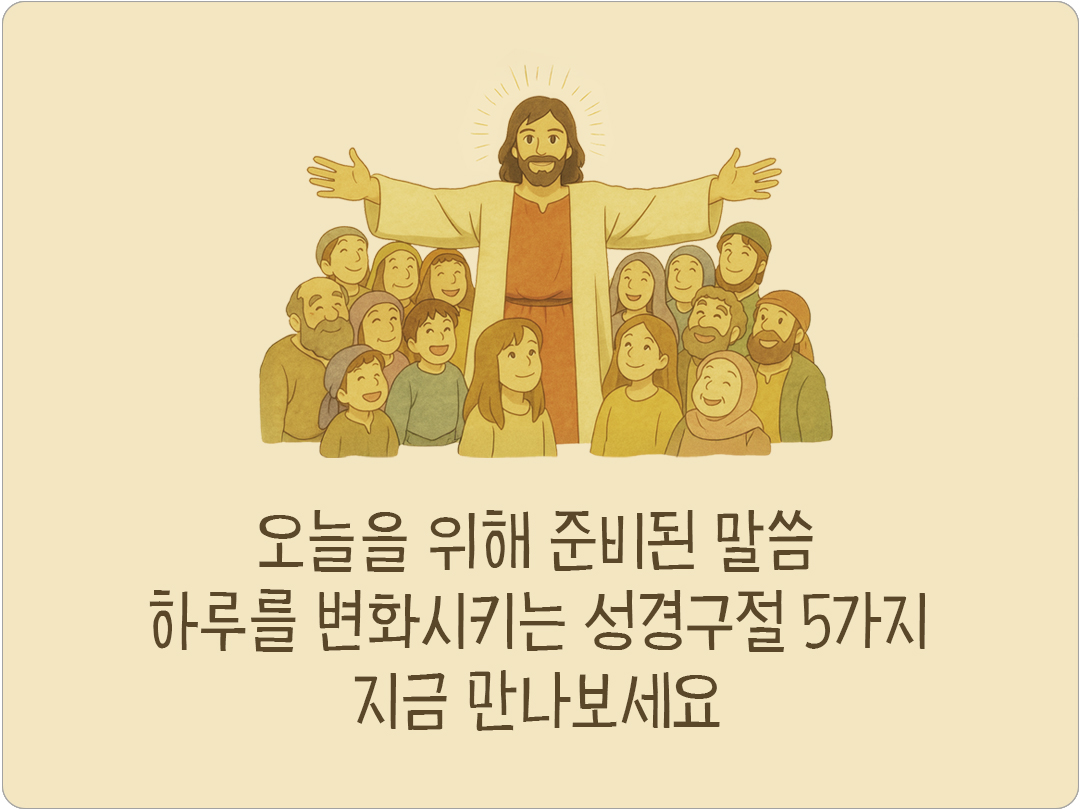 성경 말씀은 단순한 문장이 아니라 삶을 비추는 빛이 되어 하루를 변화시키는 힘이 있어요. 말씀 한 구절이 오늘을 새롭게 하고 큰 기적을 이끌어냅니다. 하루를 변화시키는 성경구절 5가지, 지금 만나보세요! 한 말씀이 오늘을 바꾸는 기적이 되기를 빕니다.