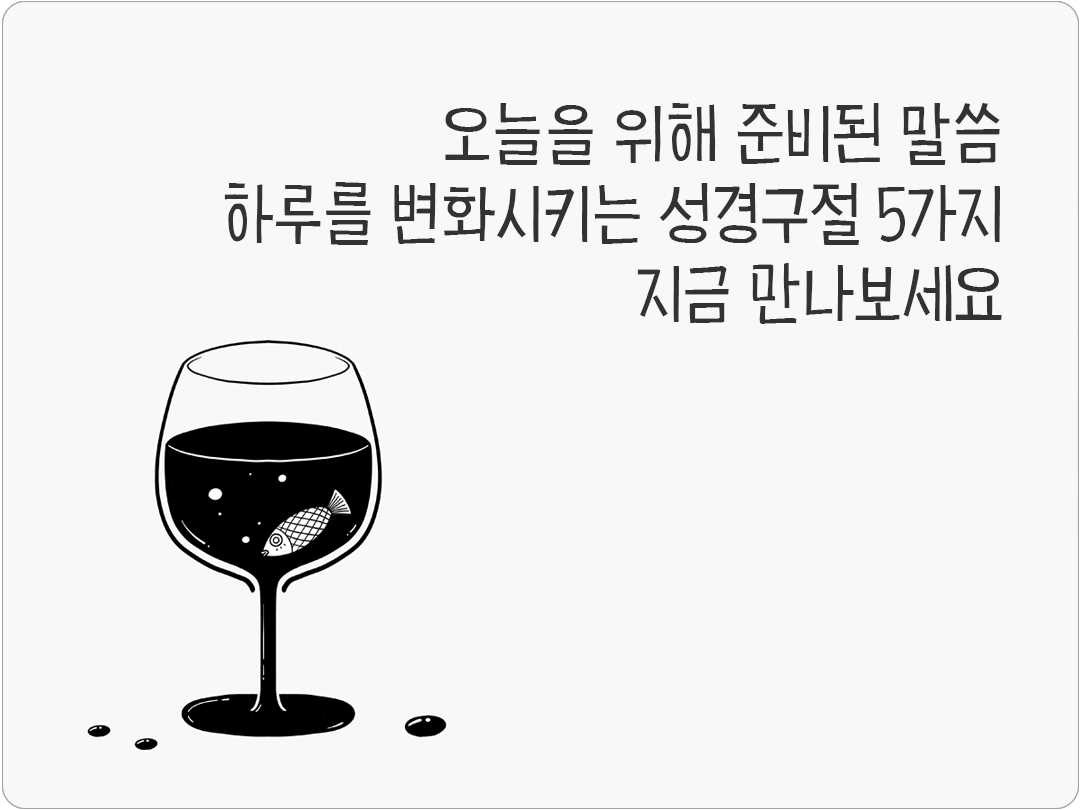 성경 말씀은 단순한 문장이 아니라 삶을 비추는 빛이 되어 하루를 변화시키는 힘이 있어요. 말씀 한 구절이 오늘을 새롭게 하고 큰 기적을 이끌어냅니다. 하루를 변화시키는 성경구절 5가지, 지금 만나보세요! 한 말씀이 오늘을 바꾸는 기적이 되기를 빕니다.