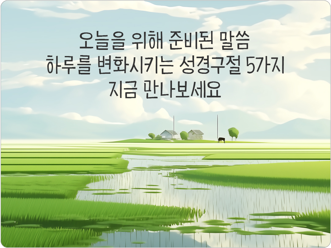 성경 말씀은 단순한 문장이 아니라 삶을 비추는 빛이 되어 하루를 변화시키는 힘이 있어요. 말씀 한 구절이 오늘을 새롭게 하고 큰 기적을 이끌어냅니다. 하루를 변화시키는 성경구절 5가지, 지금 만나보세요! 한 말씀이 오늘을 바꾸는 기적이 되기를 빕니다.