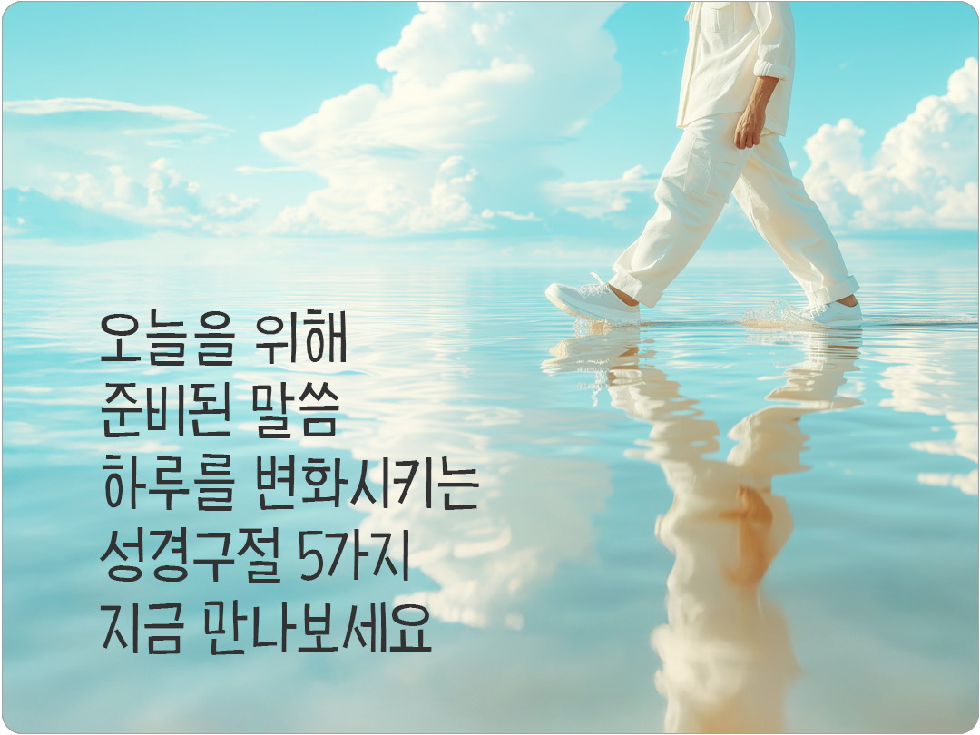 성경 말씀은 단순한 문장이 아니라 삶을 비추는 빛이 되어 하루를 변화시키는 힘이 있어요. 말씀 한 구절이 오늘을 새롭게 하고 큰 기적을 이끌어냅니다. 하루를 변화시키는 성경구절 5가지, 지금 만나보세요! 한 말씀이 오늘을 바꾸는 기적이 되기를 빕니다.