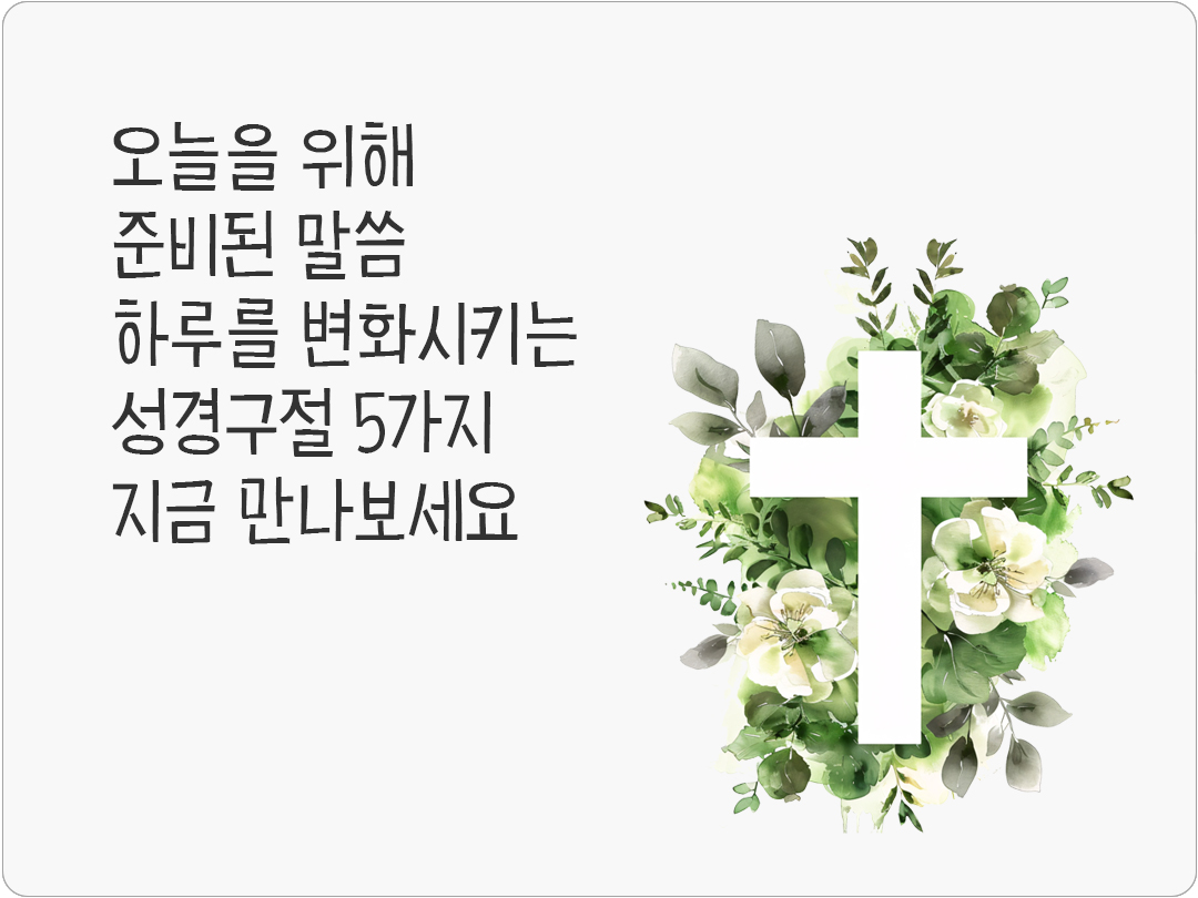 성경 말씀은 단순한 문장이 아니라 삶을 비추는 빛이 되어 하루를 변화시키는 힘이 있어요. 말씀 한 구절이 오늘을 새롭게 하고 큰 기적을 이끌어냅니다. 하루를 변화시키는 성경구절 5가지, 지금 만나보세요! 한 말씀이 오늘을 바꾸는 기적이 되기를 빕니다.