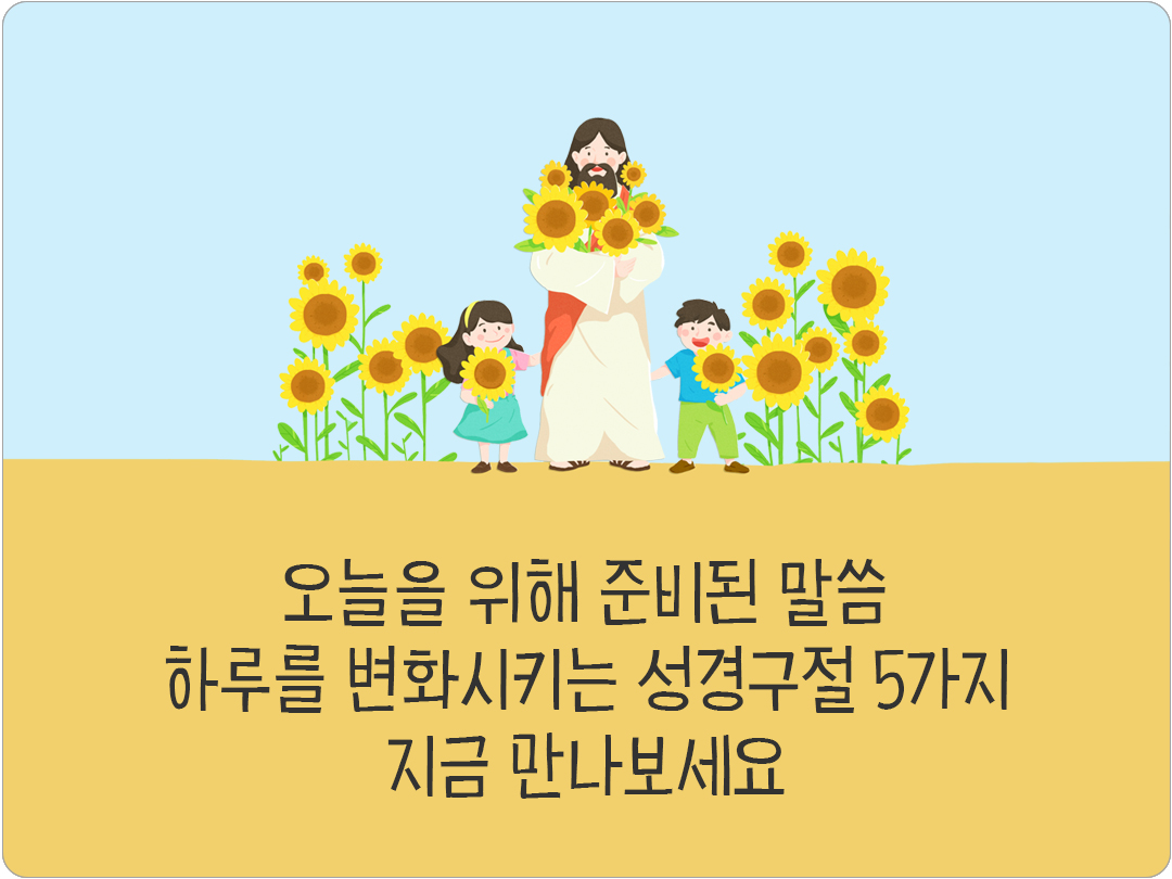 성경 말씀은 단순한 문장이 아니라 삶을 비추는 빛이 되어 하루를 변화시키는 힘이 있어요. 말씀 한 구절이 오늘을 새롭게 하고 큰 기적을 이끌어냅니다. 하루를 변화시키는 성경구절 5가지, 지금 만나보세요! 한 말씀이 오늘을 바꾸는 기적이 되기를 빕니다.