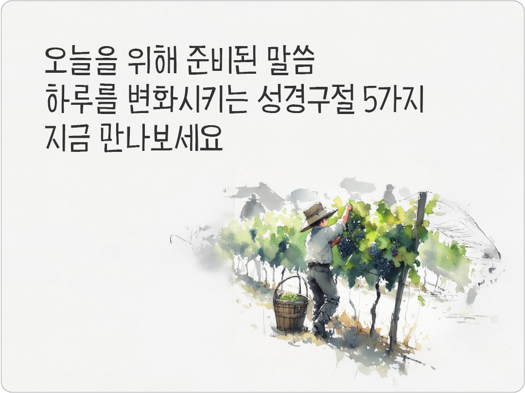 성경 말씀은 단순한 문장이 아니라 삶을 비추는 빛이 되어 하루를 변화시키는 힘이 있어요. 말씀 한 구절이 오늘을 새롭게 하고 큰 기적을 이끌어냅니다. 하루를 변화시키는 성경구절 5가지, 지금 만나보세요! 한 말씀이 오늘을 바꾸는 기적이 되기를 빕니다.