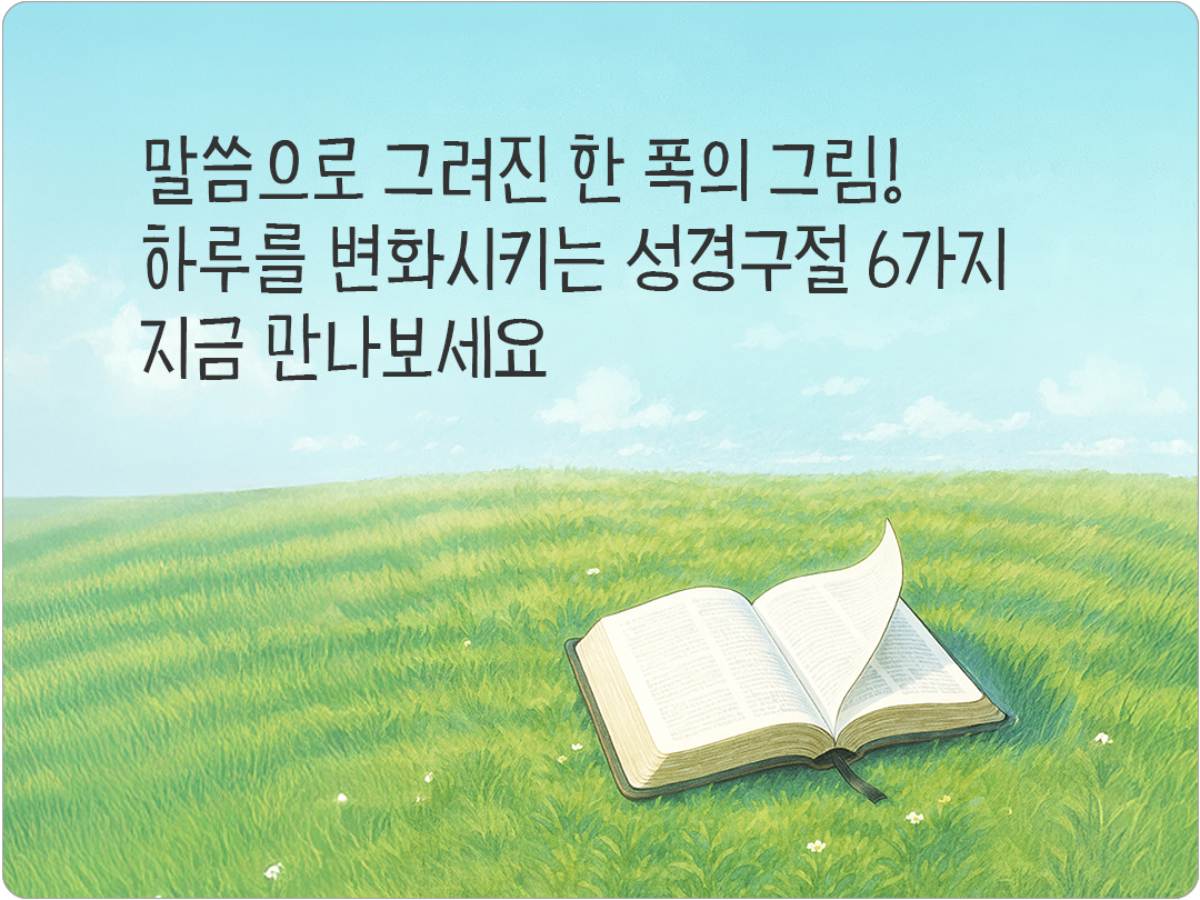 성경 말씀은 단순한 문장이 아니라 삶을 비추는 빛이 되어 하루를 변화시키는 힘이 있어요. 말씀 한 구절이 오늘을 새롭게 하고 큰 기적을 이끌어냅니다. 하루를 변화시키는 성경구절 5가지, 지금 만나보세요! 한 말씀이 오늘을 바꾸는 기적이 되기를 빕니다.