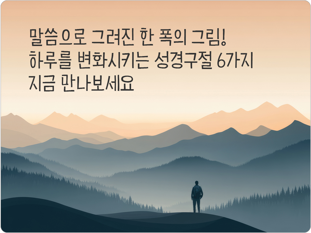 성경 말씀은 단순한 문장이 아니라 삶을 비추는 빛이 되어 하루를 변화시키는 힘이 있어요. 말씀 한 구절이 오늘을 새롭게 하고 큰 기적을 이끌어냅니다. 하루를 변화시키는 성경구절 6가지, 지금 만나보세요! 한 말씀이 오늘을 바꾸는 기적이 되기를 빕니다.
