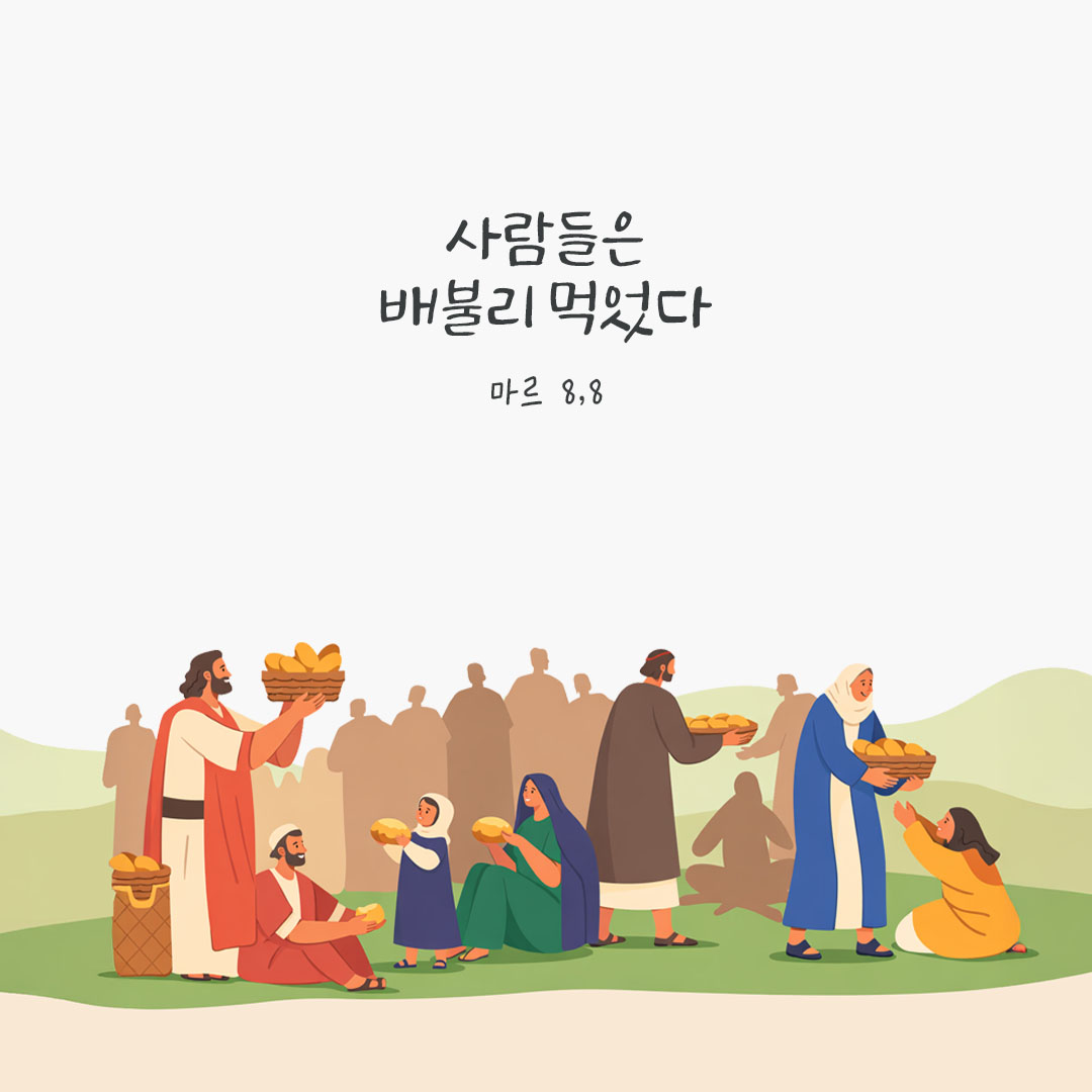 예수님께서는 빵 일곱 개를 손에 들고 감사를 드리신 다음 떼어서 제자들에게 주시며 나누어 주라고 하십니다. 성체성사를 예고하는 장면으로, 하느님의 나눔은 풍성한 은총임을 드러내십니다. 그래서 사천 명가량이나 되는 사람들이 배불리 먹게 됩니다. 여기에 어떤 차별도 어떤 부족함도 없습니다.