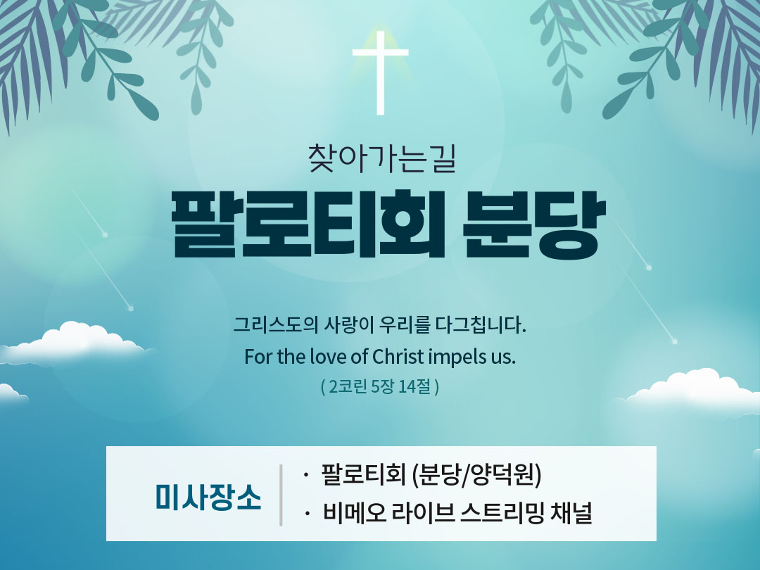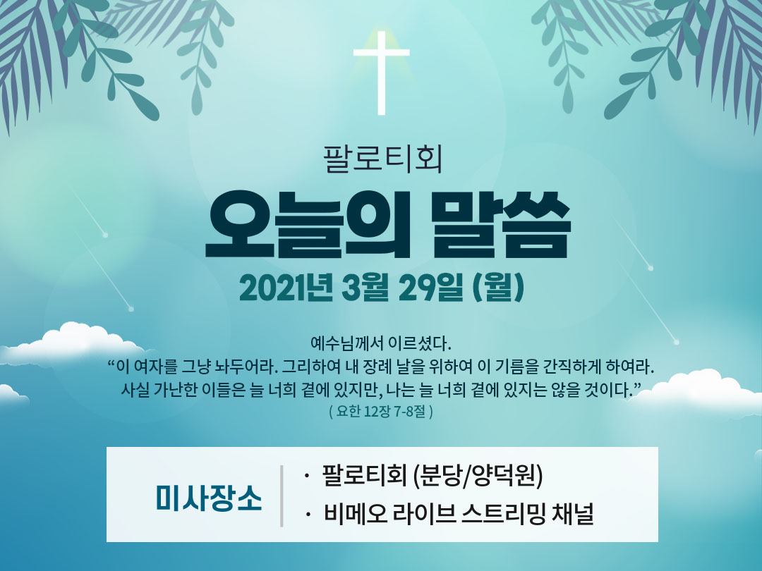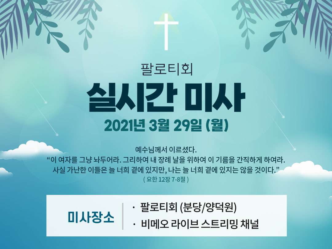 2021년 3월 29일 (월) 팔로티회 분당과 양덕원 미사시간을 공유합니다. 아래 미사시간을 클릭하면 해당 시간의 팔로티회 온라인 미사 다시보기로 이동합니다.