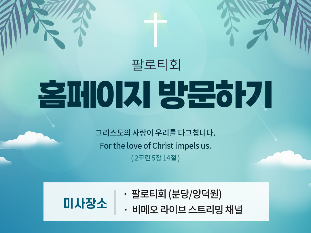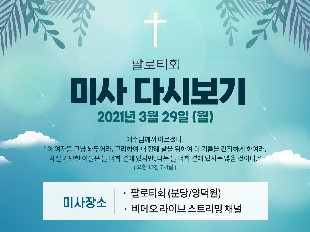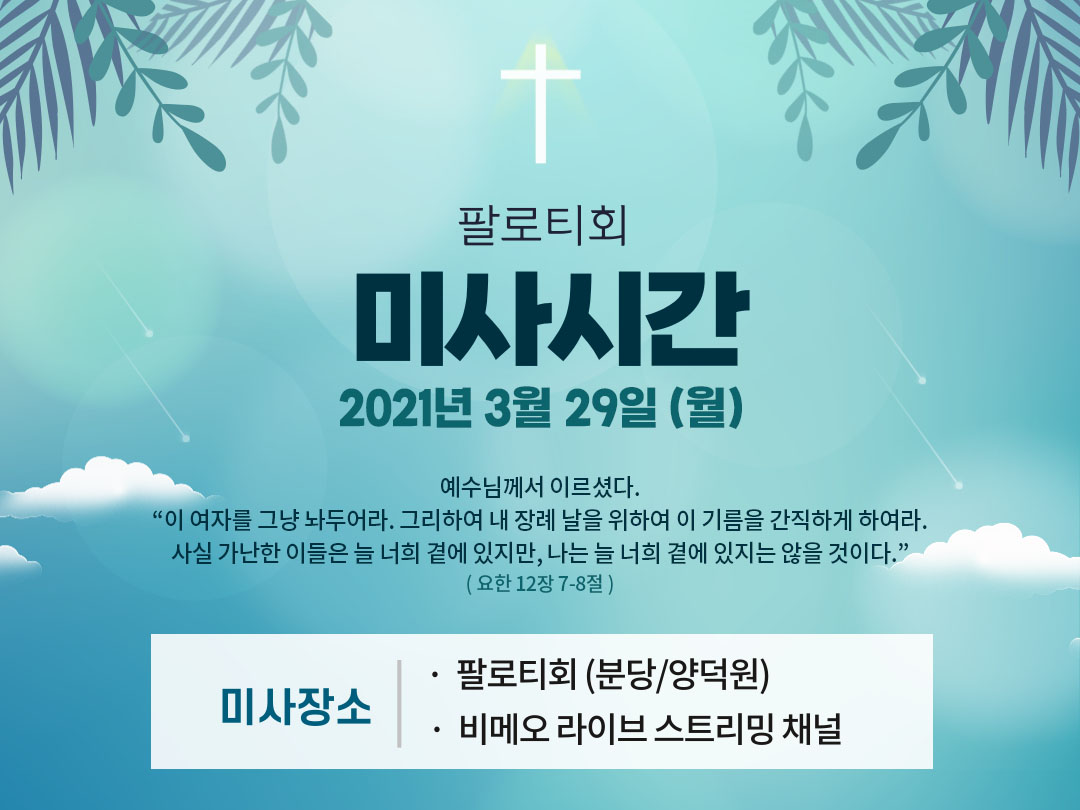 2021년 3월 29일 (월) 팔로티회 분당과 양덕원 미사시간을 공유합니다. 아래 미사시간을 클릭하면 해당 시간의 팔로티회 온라인 미사 다시보기로 이동합니다.