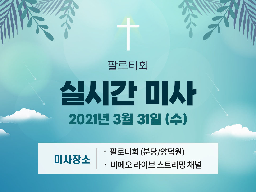 2021년 3월 31일 (수) 팔로티회 분당과 양덕원 미사시간을 공유합니다. 아래 미사시간을 클릭하면 해당 시간의 팔로티회 온라인 미사 다시보기로 이동합니다.