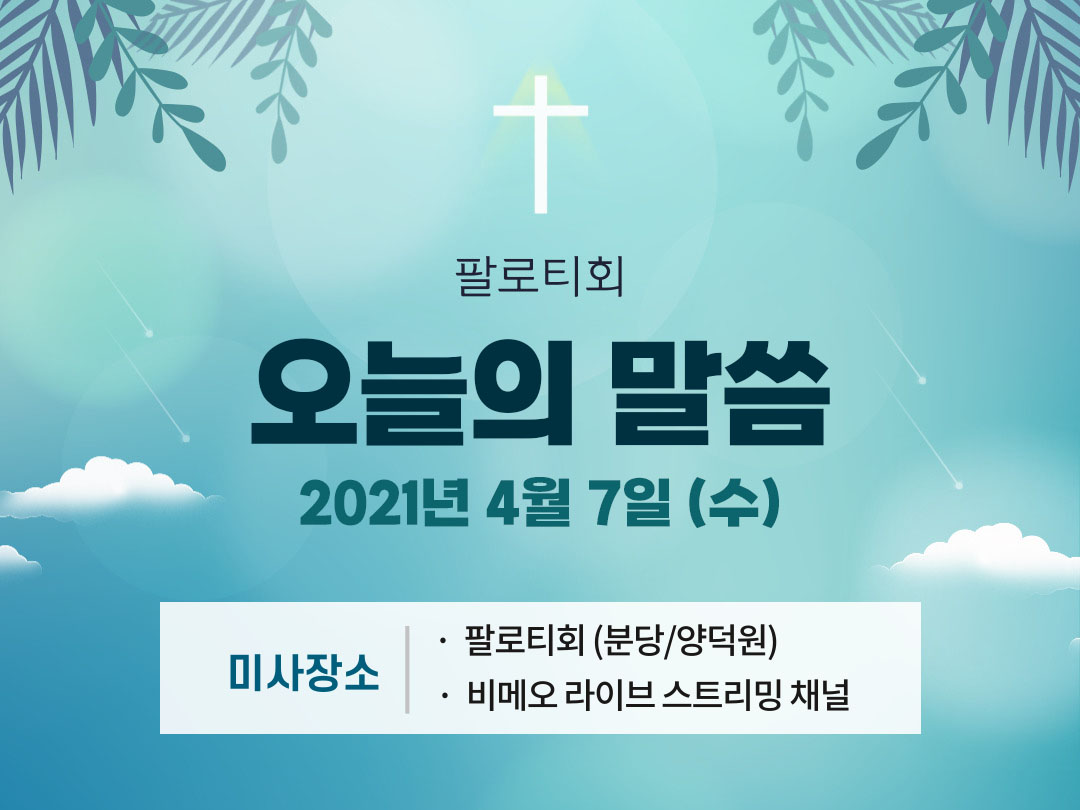 2021년 4월 7일 (수) 팔로티회 분당과 양덕원 미사시간을 공유합니다. 아래 미사시간을 클릭하면 해당 시간의 팔로티회 온라인 미사 다시보기로 이동합니다.