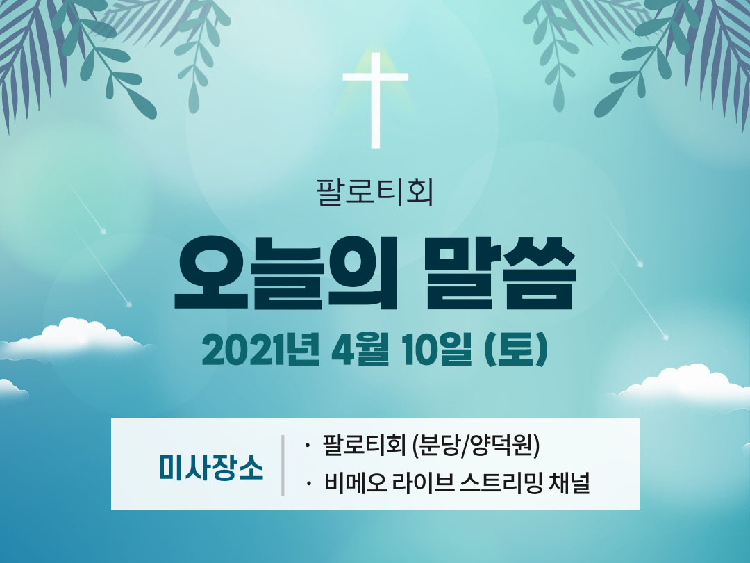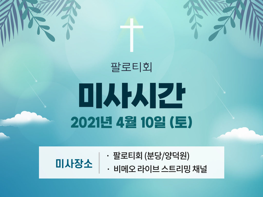 2021년 4월 10일 (토) 팔로티회 분당과 양덕원 미사시간을 공유합니다. 아래 미사시간을 클릭하면 해당 시간의 팔로티회 온라인 미사 다시보기로 이동합니다.