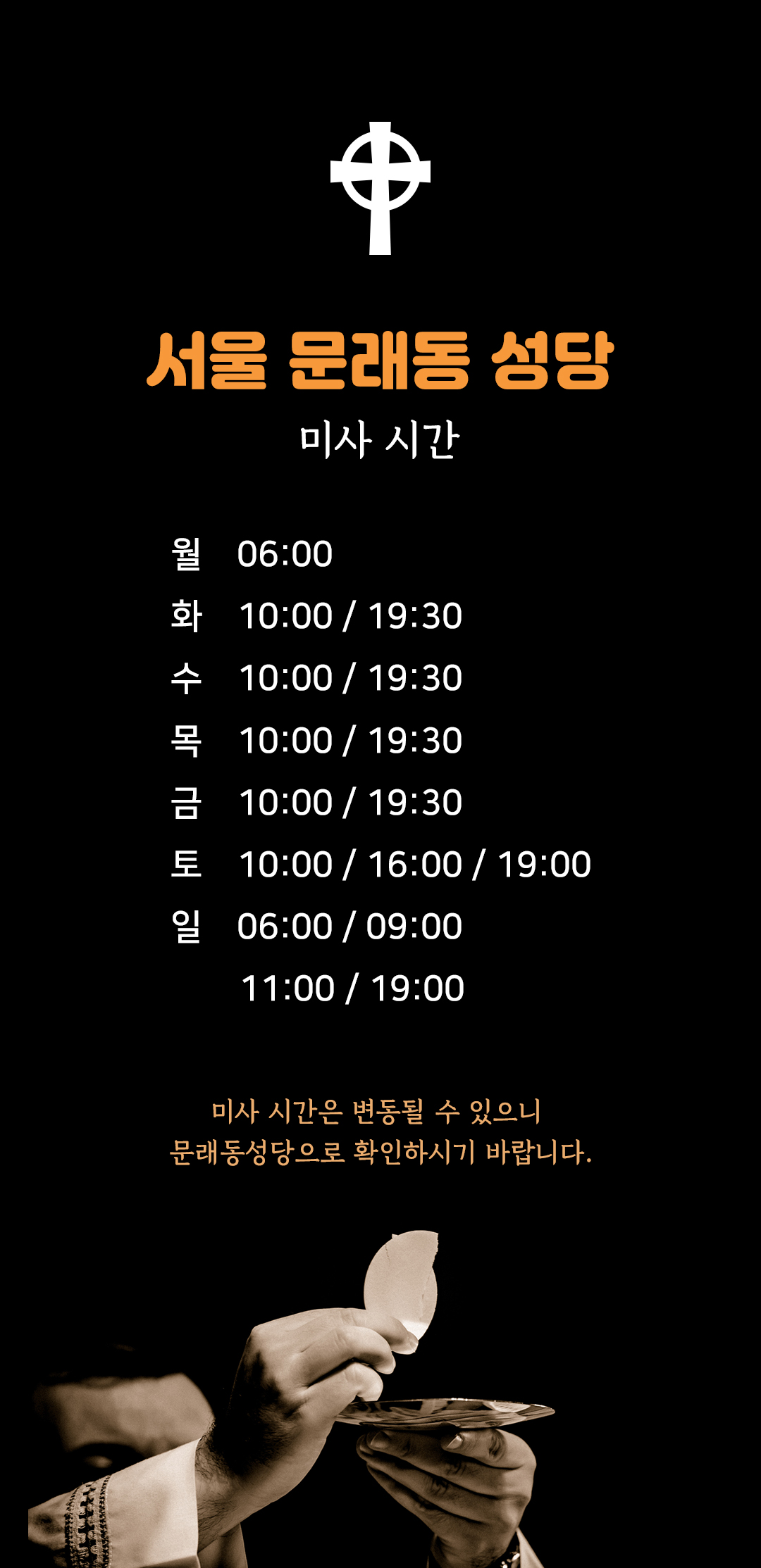 미사 시간은 변동될 수 있으니 문래동 성당 (02-2678-0875)으로 확인하시기 바랍니다. 전화번호를 클릭하면 문래동성당으로 연결됩니다.